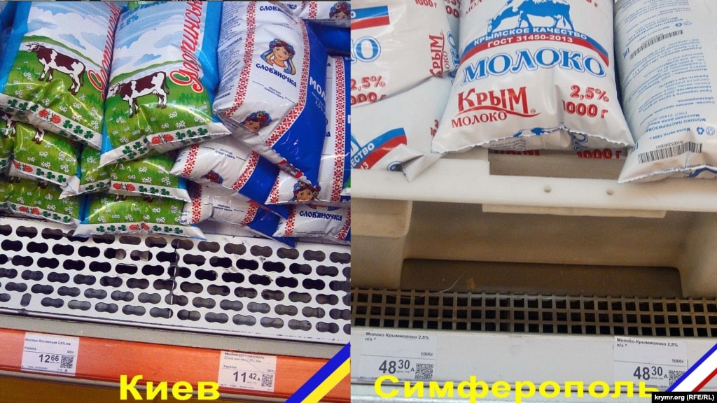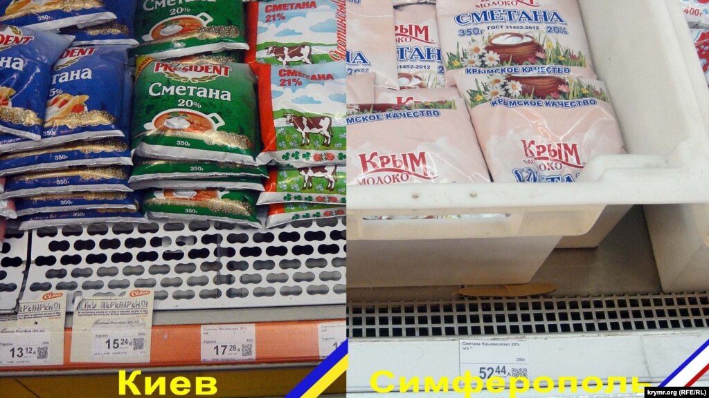 Фотографии прилавков с продуктами и ценами расположены рядом, слева – супермаркет в Киеве, справа – в Симферополе. Чтобы не было ошибок, фотографии подписаны и помечены цветами флагов Украины и Крыма.